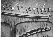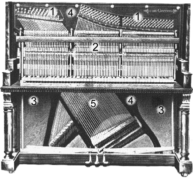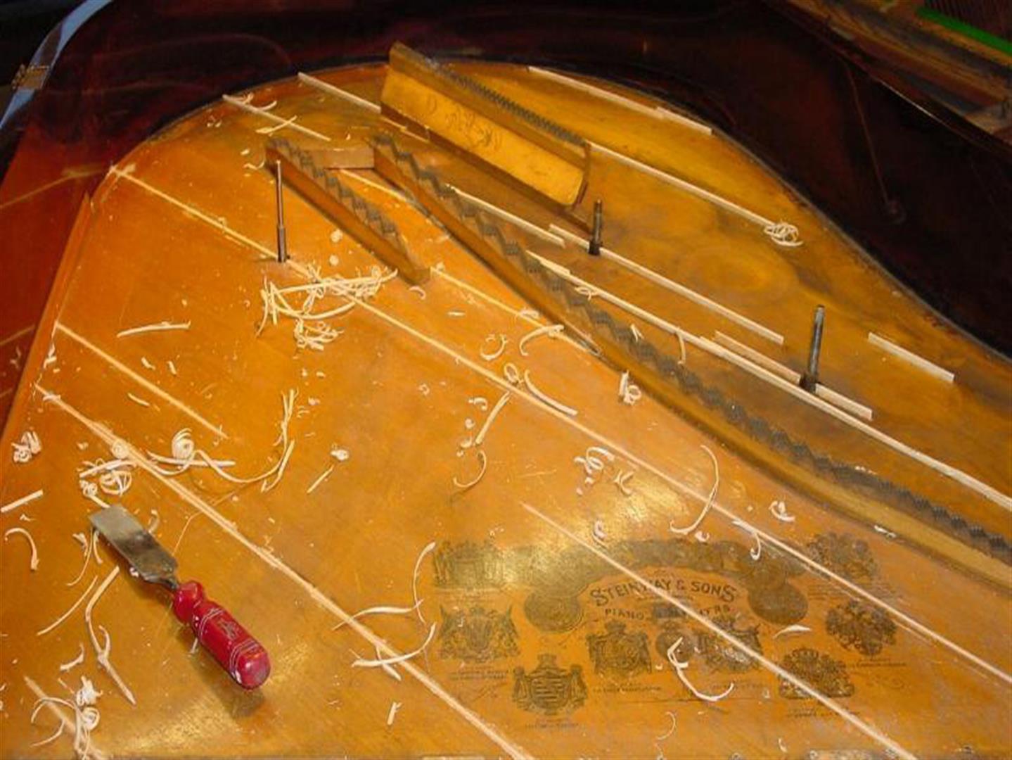 In een piano zitten ± 220 snaren en elke snaar wordt gemiddeld tussen de 70 en 80 kg opgetrokken. Dus komt er door de hoge spanning van de snaren gemiddeld zo’n 17000 kg en bij vleugels wel tot 20000 kg. aan trekkracht op het pantserraam te staan. Of het nu een lage met koper omsponnen bassnaar is of een blanke snaar in de hoogste regionen, de trekkracht per snaar is overal enigszins gelijk. Het is dus van groot belang, dat de onderdelen in een goede conditie verkeren. In het stemblok mogen geen scheurtjes zitten en de stempennen, waaraan de snaren bevestigd zijn, mogen niet los in de gaten zitten en naar beneden hangen, wat dan de stemvastheid in gevaar brengt. Om daar achter te komen kijk je tussen de stempennen (zie foto*).